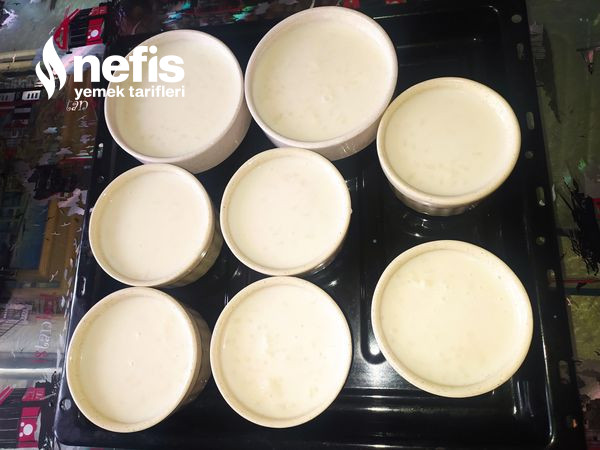 4. Sütlaçlarımızın fırın kaselerine boşaltıp tepsiye dizelim ve tepsiyi az ölçüde su ile doldurup fırına verelim.