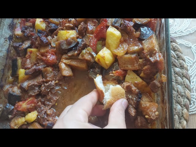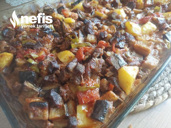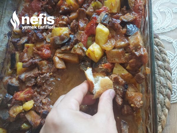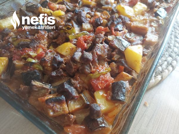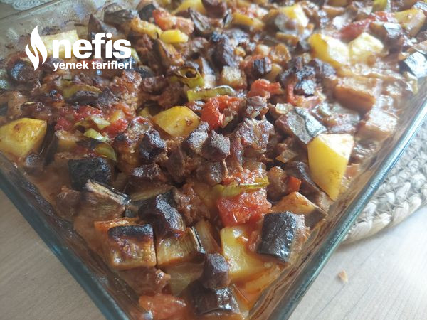 1. Tepsiye kuşbaşı doğranmış etleri küp küp doğranmış patlıcan, patates, soğan, biber, tuz, baharat ve salçayı ekleyelim sıvı yağ ve suyu da ek ederek güzelce karıştırarak tepsiye yayalım. Üzerine ıslatılmış buruşturulmuş yağlı kağıdı kapatalım.