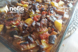 1. Tepsiye kuşbaşı doğranmış etleri küp küp doğranmış patlıcan, patates, soğan, biber, tuz, baharat ve salçayı ekleyelim sıvı yağ ve suyu da ek ederek güzelce karıştırarak tepsiye yayalım. Üzerine ıslatılmış buruşturulmuş yağlı kağıdı kapatalım.