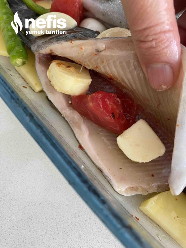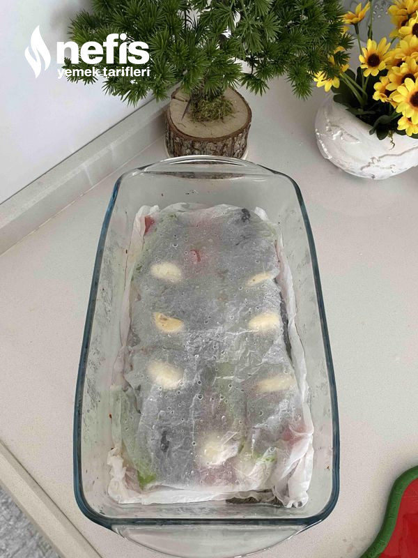 - Balıkların etrafına da zerzevatları domates, biber,patates arpacık soğan yerleştirerek üzerine pişime kâğıdı su ile ıslatıp üzerini kapatalım.
