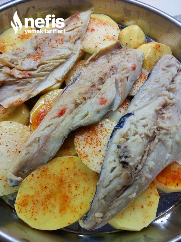 - Balıklar kılçıkları temizlenip derisi alta gelecek halinde patatesin üzerine yerleştirilir ve baharatlar atılır.