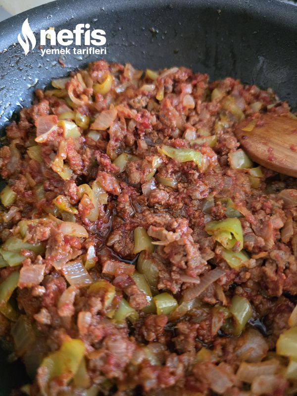 - Kıyma harcı için evvel soğanlarımızı yağda pembeleşinceye kadar kavuruyoruz, sonra biberlerimizi atıyoruz, sonra kıyma ve akabinde salçamızı tuzumuzu atıyoruz.