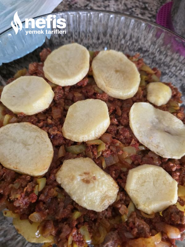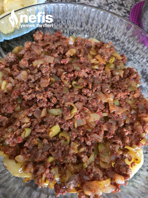 - Borcama alt katman patatesleri diziyoruz kıyma harcını ekliyoruz.