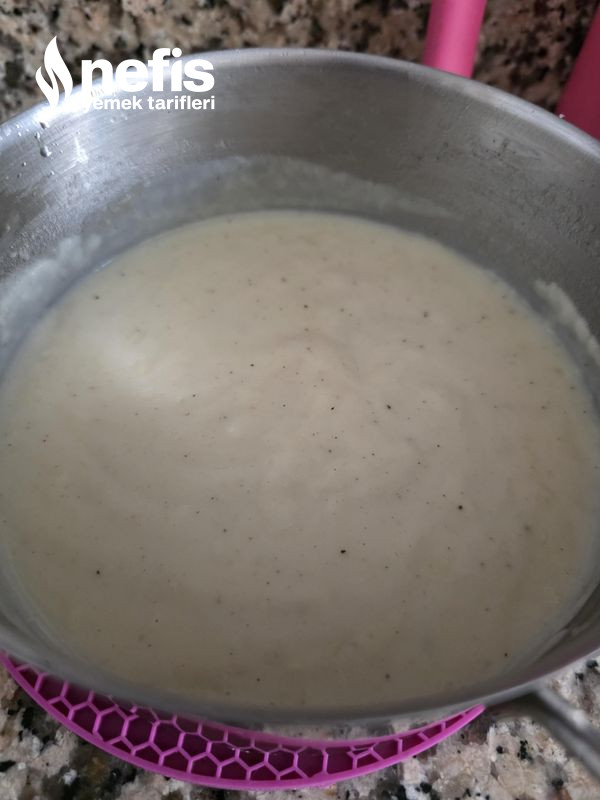 - Daha sonra üzerine 1. 5 su bardağı süt ek ediyoruz tuzunu karabiberi atıp daima çırpıyoruz kaynadığında ise soğumaya bırakıyoruz.