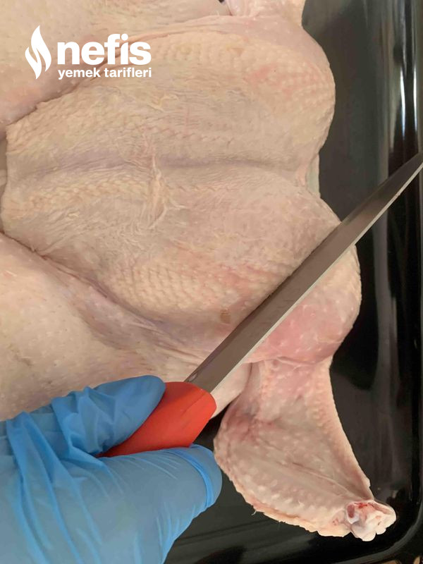 1. Tavuğun marinesi için; bütün materyalleri bir kaba alıp güzelce karıştıralım. Tavuğumuzu göğüs kısmından uzunluklu boyunca kesip tavuğumuzu açalım.