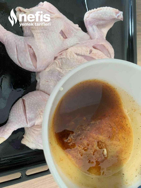 2. Fırın tepsisine koyduğumuz tavuğumuzun üzerine çizikler atıp sosumuzu tavuğun her yerine sürelim. Üzerini güzelce kapatıp dinlenmesi için dolapta bir kaç saat dinlenmeye bırakalım.