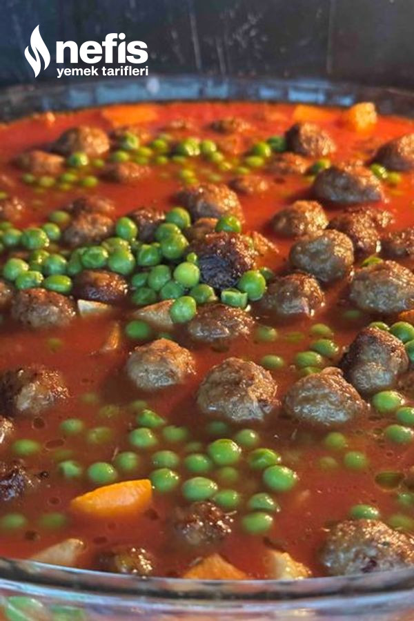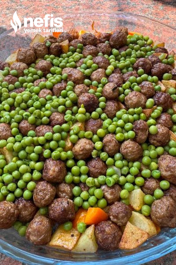 7. Köfteleri de borcama alalım ve üzerine haşlanmış bezelyeyi ekleyelim.