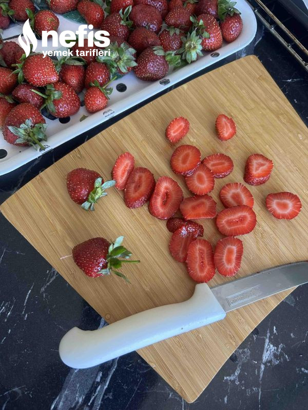 - Çilekleri 2-3 suda güzelce yıkayalım uygunca kumundan arındıralım yeşil kısımlarını keselim ince ince doğrayalım.
