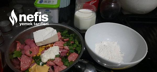 1. Öncelikle iç dolgumuzu hazırlayalım. Zeytin, sosis, sucuk, mısır, maydanoz, mayonez, peynir çeşitlerini bir kaba alalım karıştıralım.