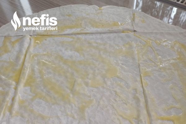 2. Daha sonra bir yufkamızı büsbütün açıp yarısını soslayıp başka yarısını sosladığımızın üzerine örtüp ikiye katlıyoruz .