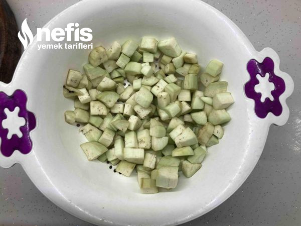 2. Patlıcanlarımızı küp küp doğrayıp 10 dakika tuzlu suda bekletelim.