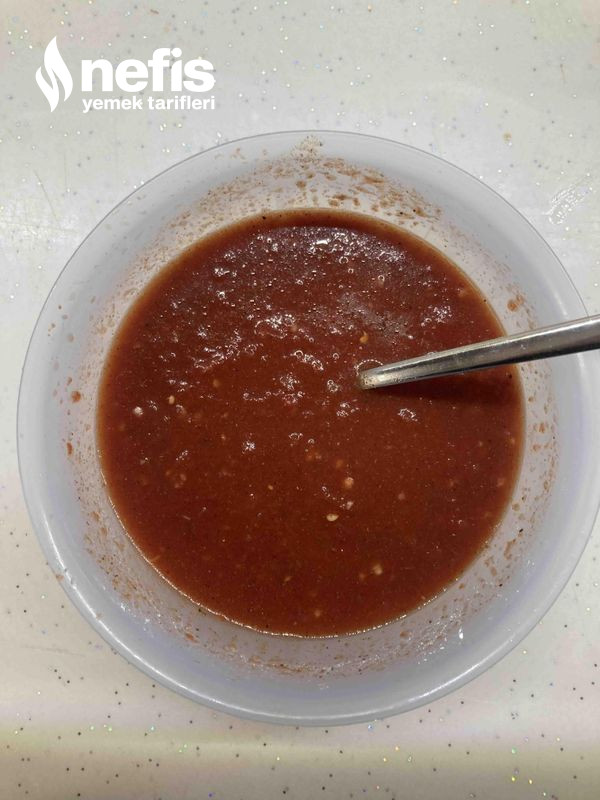 6. Ayrı bir kapta soslu gereçlerinin hepsini güzelce karıştıralım. (ben sosta kullandığım suyu haşladım etin suyundan kullandım).