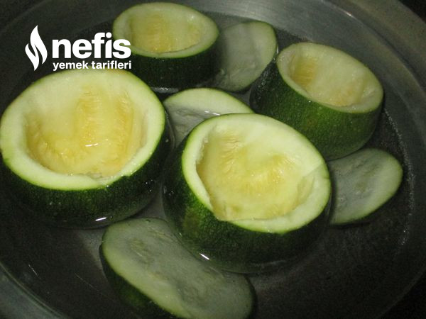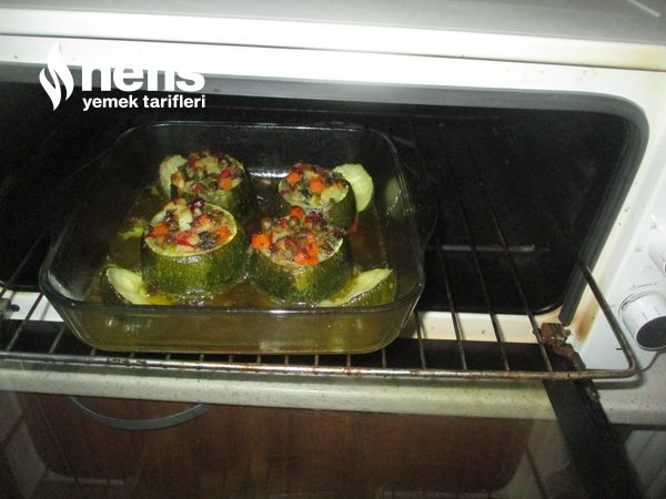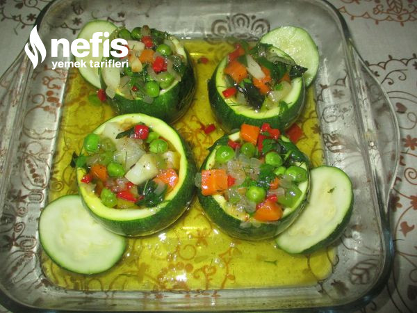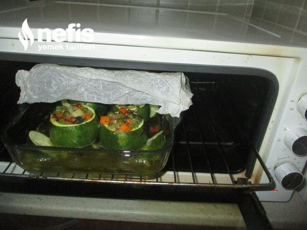 11. Garnitürun içine ince kıyım yeşillik koyup karıştıralım, bir kaşık yardımıyla kabakların içlerini dolduralım su, yağ ,tuz karıştıralım üzerine gezdirerek yavaşça dökelim.