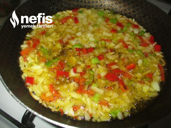 4. Biberlerin çekirdeği çıkarıp küçük doğrayalım, tavaya yağı koyalım soğan sarımsağı ek edip karıştıralım.