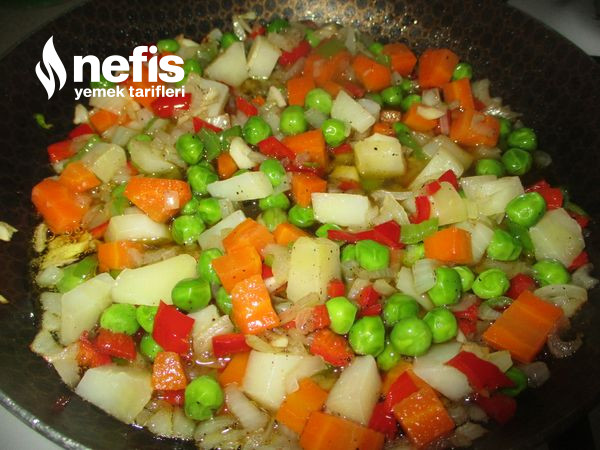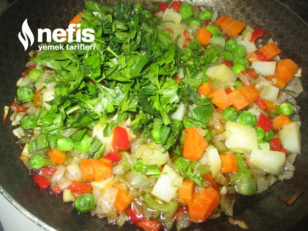 6. İki üç dk kısık ateşte pişirelim, garnitürleri ek edip karıştıralım ,bir iki dk kısık ateşte kavuralım.