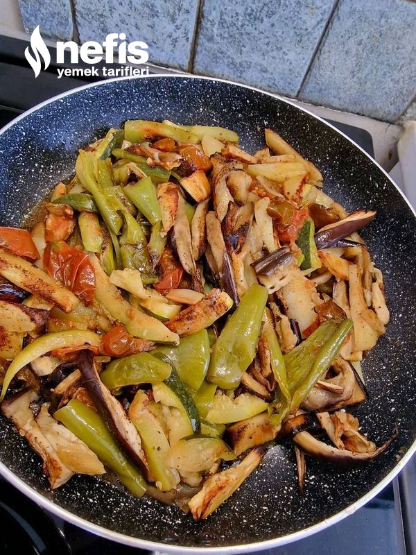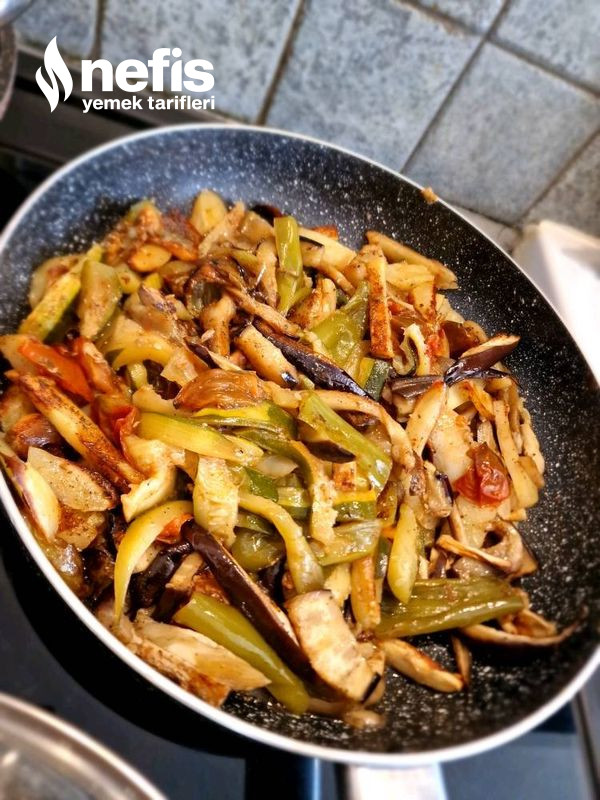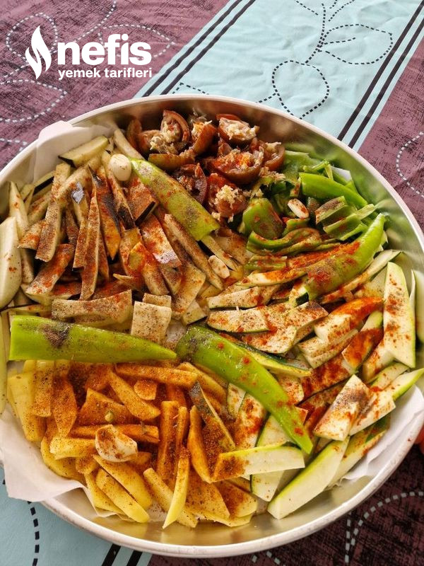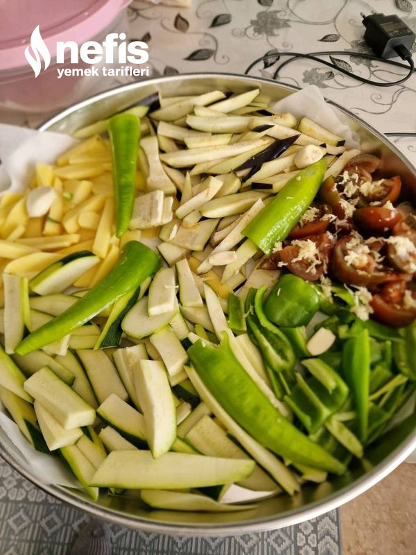 - Sebzeler güzelce yıkanır patlıcan ve kabak aralıklı soyulur ,patatesi soyulur ve istenilen biçimde doğranır. Tepsiye dizin.