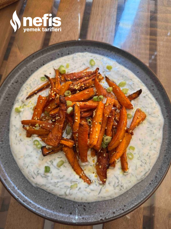 - 1 tabağa yoğurt sosumuzu yaydıktan sonra fırından çıkardığımız havuçları koyuyoruz ve son olarak süslemesi için taze soğanı ince ince keserek serpiştiriyoruz. Afiyet olsun.