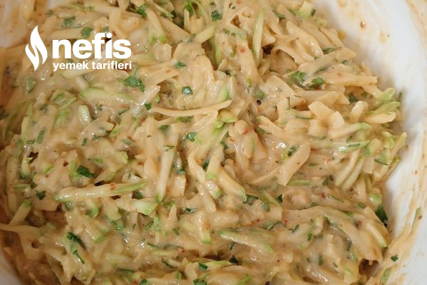 - Sonra maydanoz ince kıyalım sonra kabağı ve patatesi rendeleyip suyunu düzgünce sıkıp hazırladığımız karışıma ekleyelim ve karıştıralım.