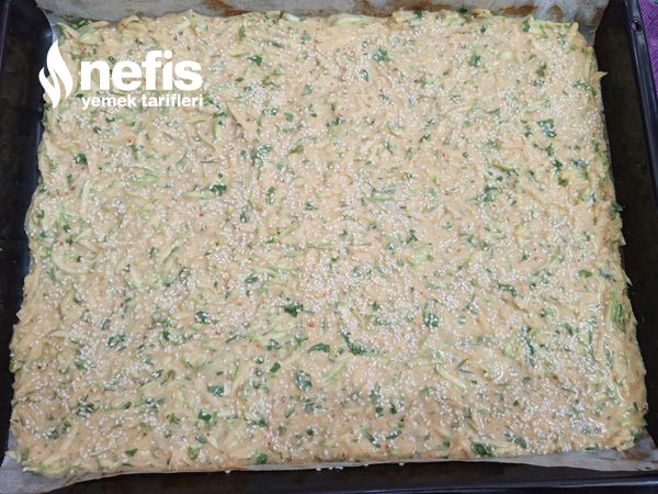- Hazırladığımız mücver çamurunu yağlı kağıt serili tepsimize güzelce yayalım ve üzerine susam serpil 180 derece fırında kızarana kadar pişirelim.
