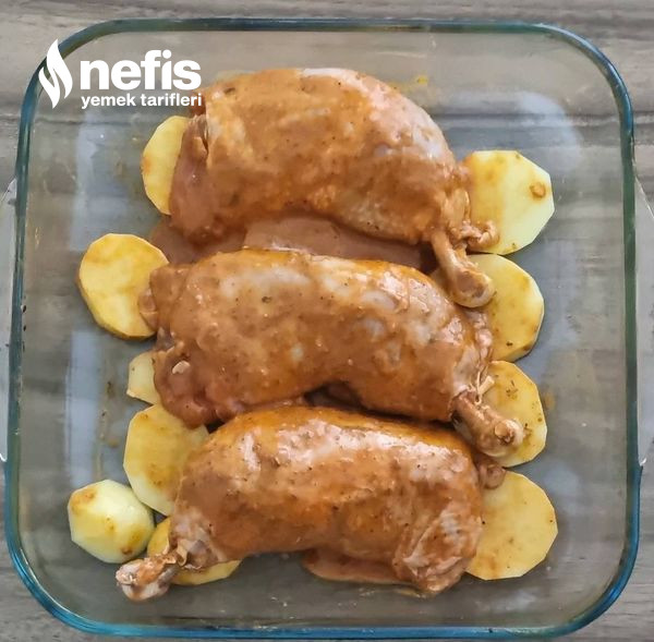 2. Sosu için; materyal listesindeki tavuk ve patates haricindeki tüm materyalleri karıştırarak tavukları ve derilerini marineleyip dolabımıza koyarak 2 saat dinlendiriyoruz.