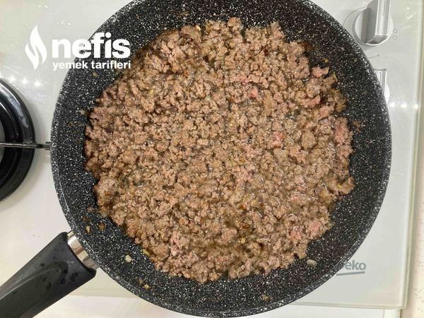 2. Kıymayı ekleyip, suyunu salıp, çekinceye kadar pişirelim.