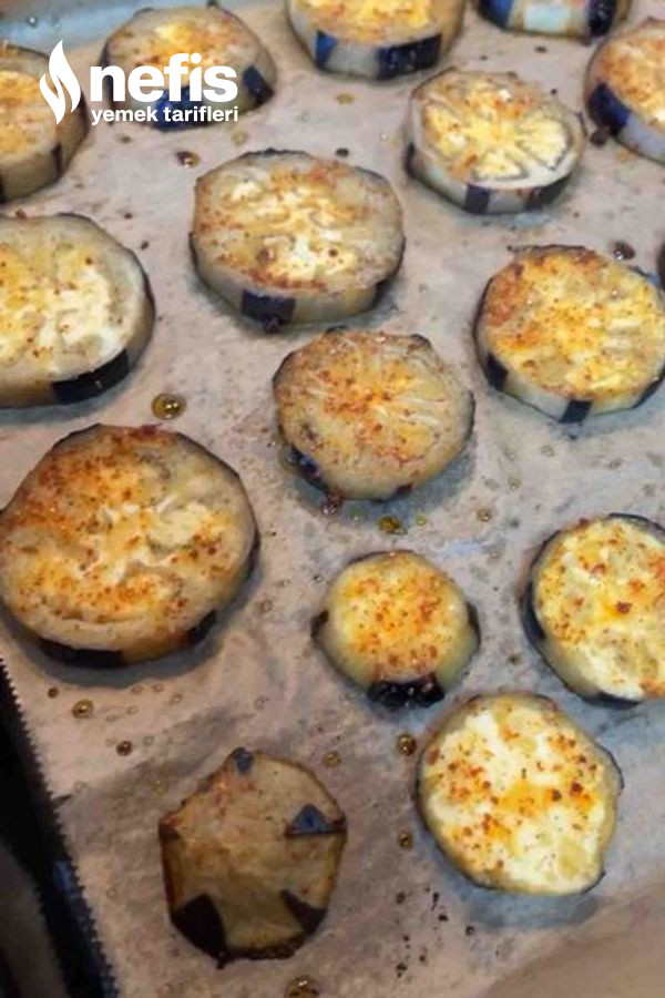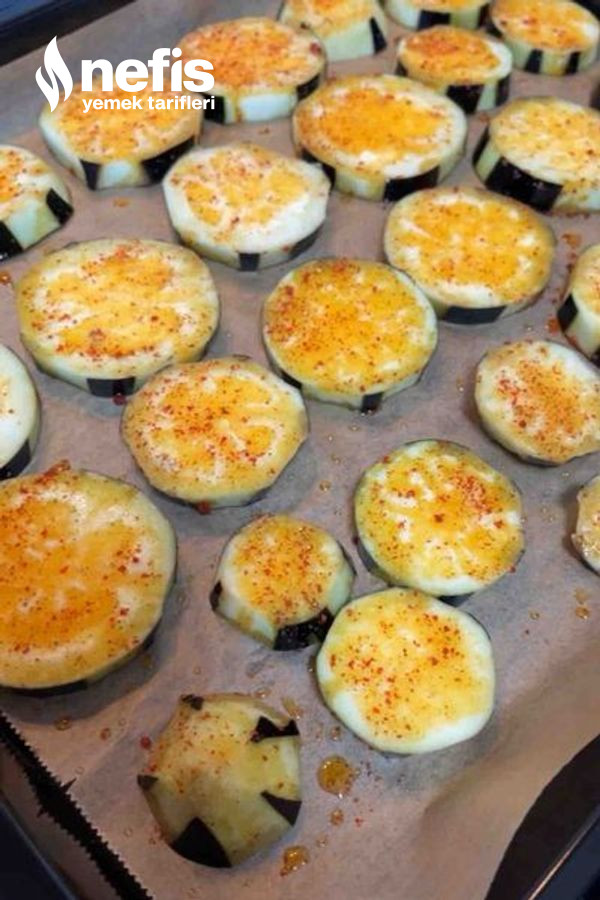 6. Patlıcanların suyunu süzüp kurutun fırın kağıdı serili tepsiye dizip üzerine sıvı yağ ve baharatlı karışımı önlü artlı sürüp evvelce ısıtılmış fırında 20 dakika pişirin.