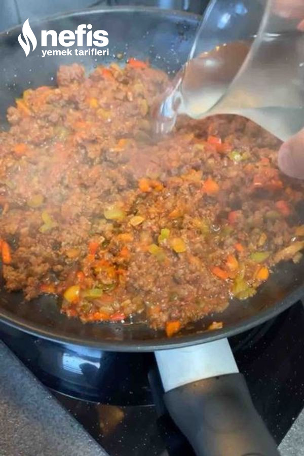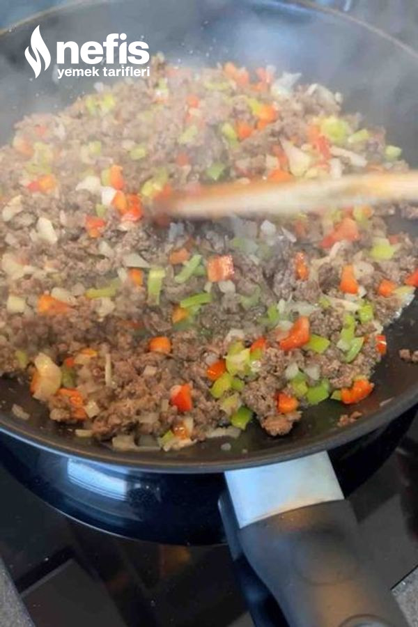 2. Kıymalı harcı için tavaya sıvı yağı ekleyip üzerine kıymayı ek edip rengi dönene kadar kavuruyoruz.