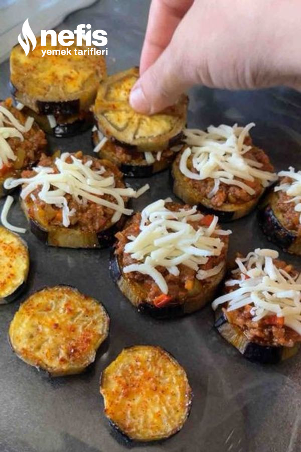 7. Fırından çıkan patlıcanları uygun bir fırın kabına bir kat dizin üzerine kıymalı harçtan koyup üzerine bir tutam kaşar ek edin .