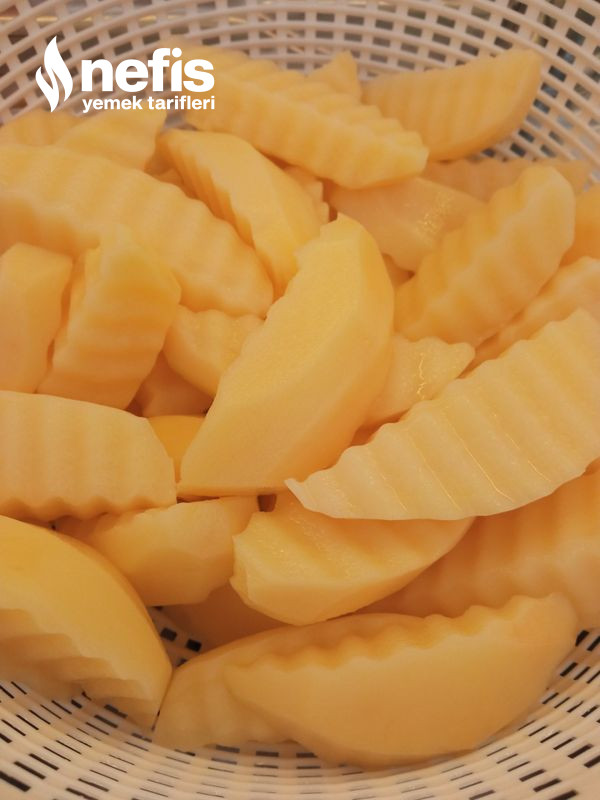 - Pataslerin kabuklarını soyun, patatesleri evvel,boydan ikiye, sonra dörde, elma dilimi halinde doğrayın.