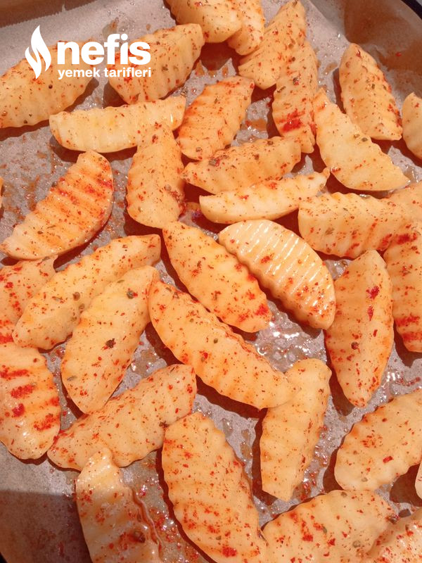 - Karıştırma kasenin içene zeytinyağı,kekik, pul biber, toz kırmızı biber, tuz ek ederek birlikte karıştırın. Akabinde patatesleri ek ederek, tüm harcı karıştırın. Yağlı kağıt serilmiş fırın tepsisine,patatesleri dizin.