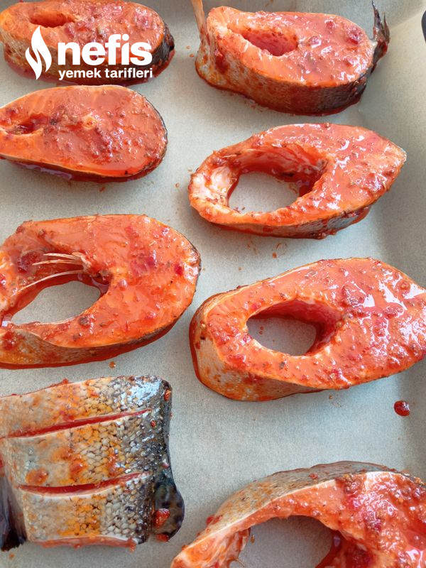 - Sosda bekletilen somon balığını, yağlı kağıt serilmiş fırın tepsisine,aralıklı olarak dizin.