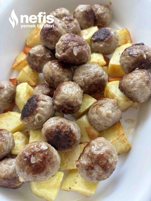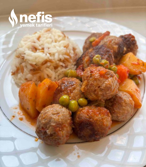 - Sebzeler kızardıktan sonra birebir tavada köfteleri kızartalım, kızaran zerzevat ve köfteleri fırın kabına aktarın, bezelyelerin suyundan süzüp köftelerin üzerine aktarın.