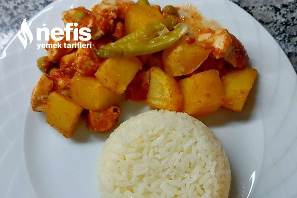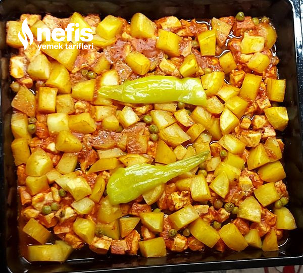 - Tavukları doğrayıp fırın tepsisine alalım üzerine kare kare patatesi doğrayalım,bezelyeyi de ek edelim.
