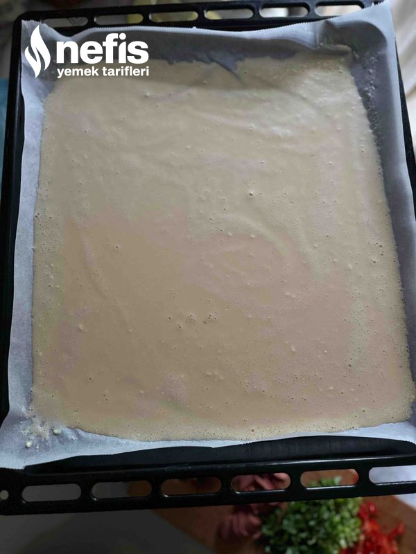 - Hamurun kıvamı biraz cıvık oluyor tepsiye yağlı kağıt seriyoru ve üzerine hamurumuzu döküyoruz sulu hamur olması gerekiyor.