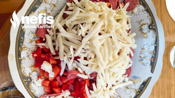 - Evvelâ bir tabağa sucuğu, kırmızı biberi çok küçük olmayacak formda küp küp doğrayalım. Rendelenmiş kaşar peynirinide ek edip harmanlayalım. Bu bir kenarda kalsın 😊