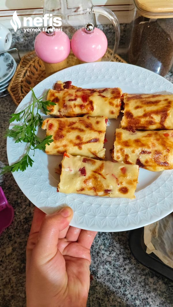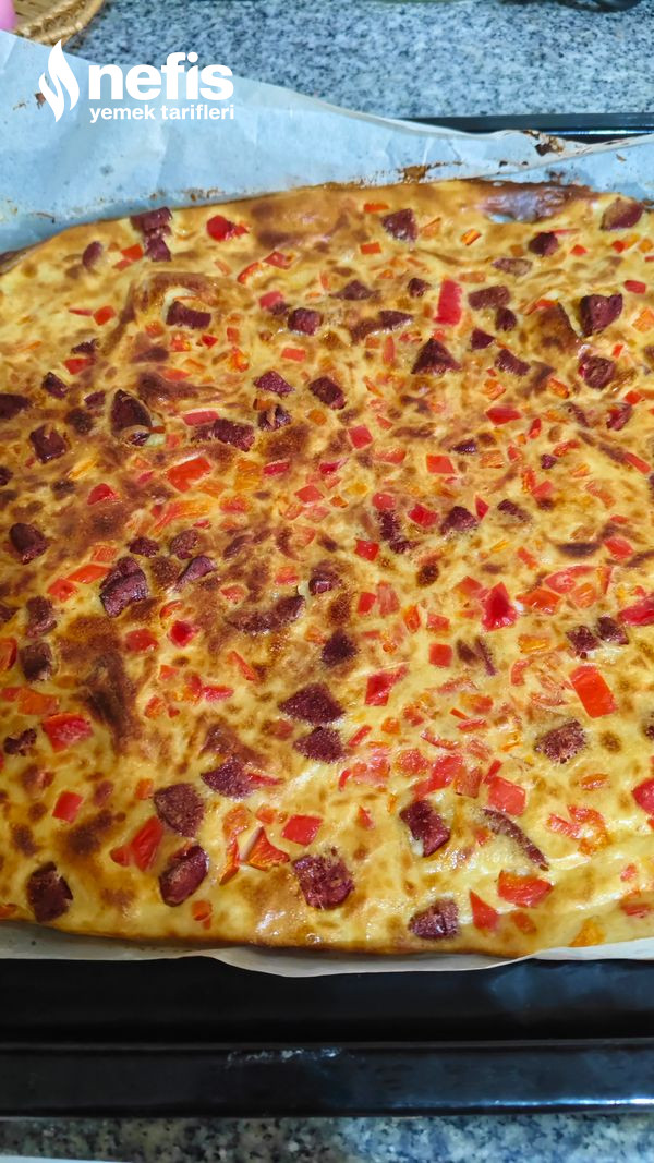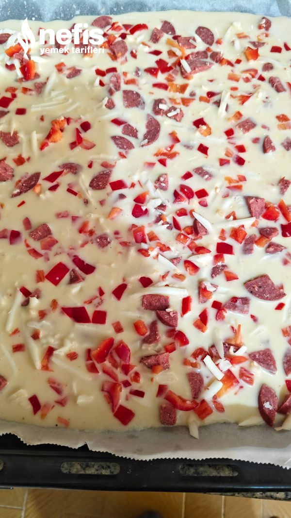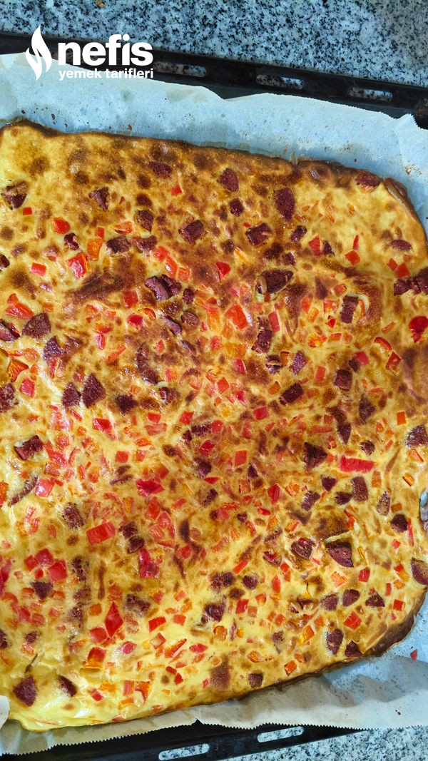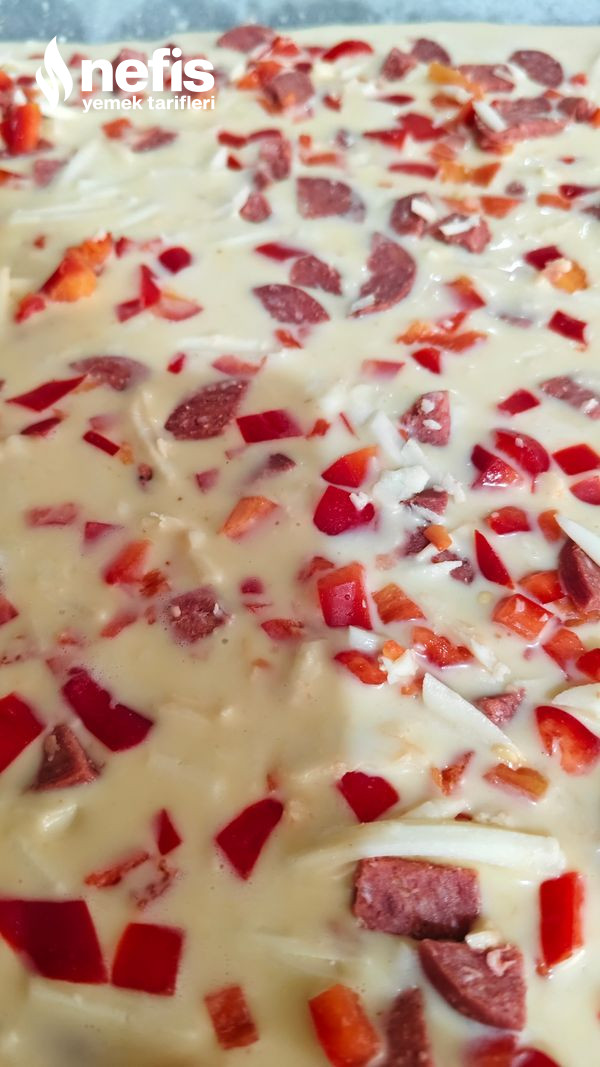 - Fırın tepsisine yağlı kağıt serip, bu krep karışımını tepsiye döküp sonra üzerine doğradığımız sucuklu karışımı ekleyelim.