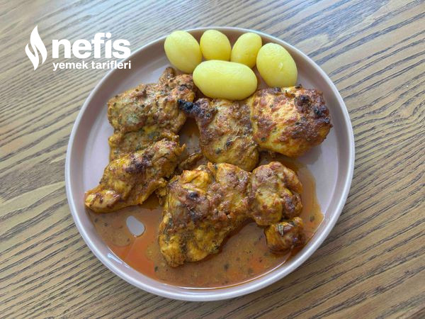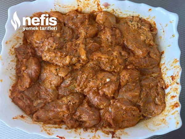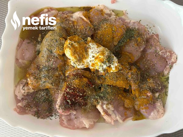 - 9 kesim kemiksiz tavuk etlerimizi yarım çay bardağı zeytinyağ, 1 yemek kaşığı salça, 1. 5 yemek kaşığı yoğurt, 1 çay kaşığı kimyon, köri tozu, kekik, nane ve tuz ile harmanlıyoruz.