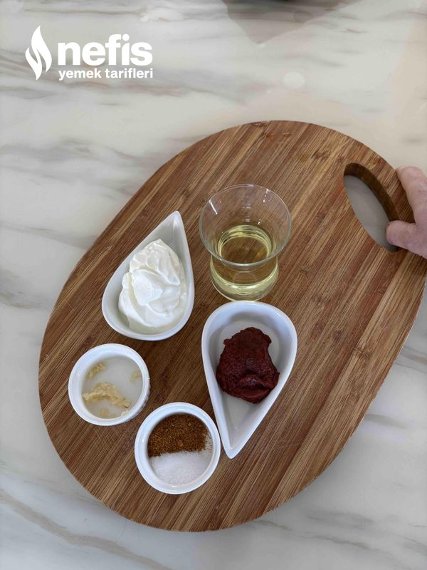 2. Sonra marinesi için olan gereçlerden sarımsağı eziniz yoğurdu ,salçayı ,sıvı yağını ve baharatları koyup güzelce karıştırınız.