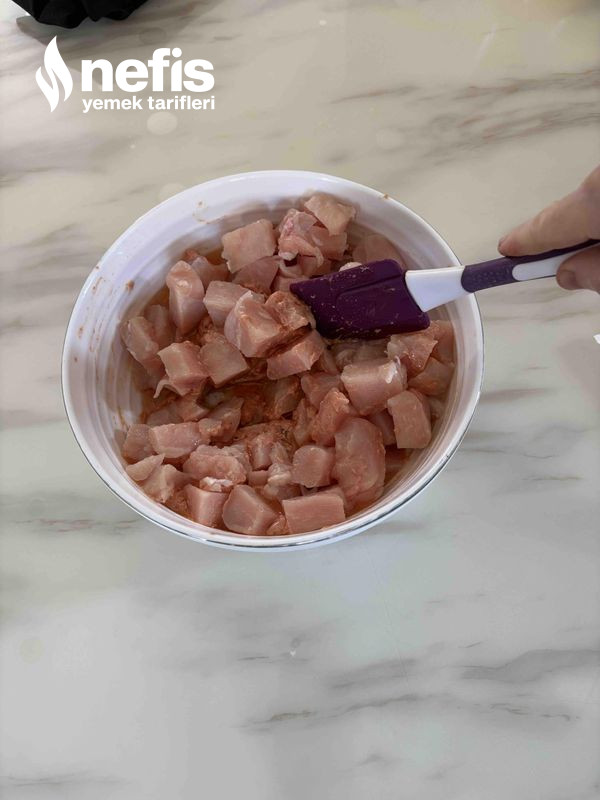 3. Sonra kesmiş olduğunuz tavukları hazırlamış olduğunuz sosun içine koyup güzelce karıştırınız vaktiniz varsa 2-3 saat bekletiniz. Daha yumuşak olur. Benim vaktim olmadığı için çabucak yaptım.