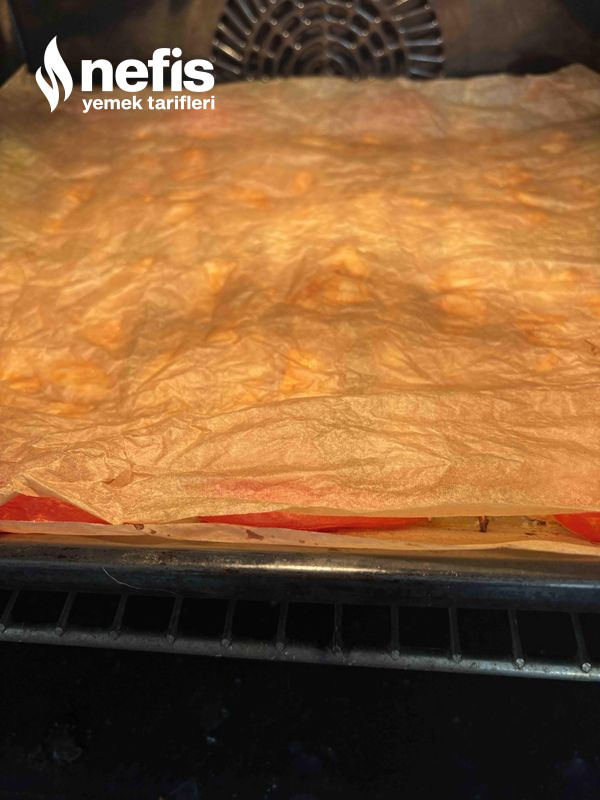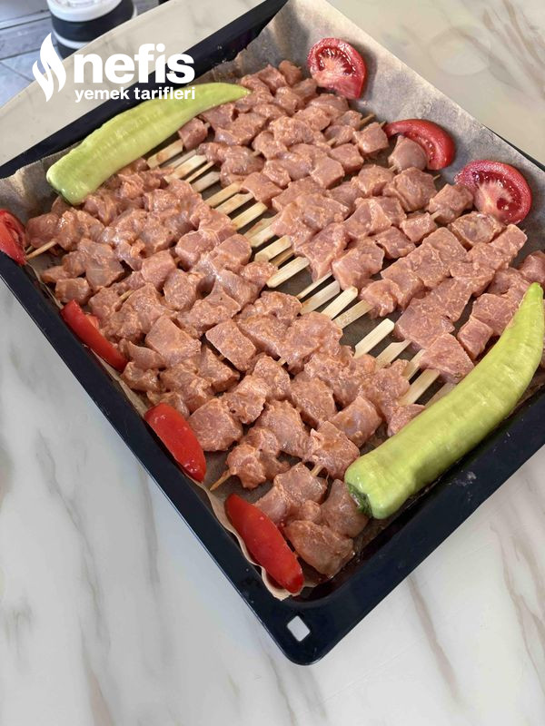 4. Sonra şişlere takip fırın tepsisine yağılı kağıt serip üzerine diziniz ,isterseniz benim üzere kenarlarına domates ve biber koyunuz üzerine yağlı kağıdı ıslatıp seriniz olağan de alüminyum kağıdı kullanılıyor lakin ben ziyanlı olduğunu için üzerine tepsi kapatıp o denli pişiriyoru.