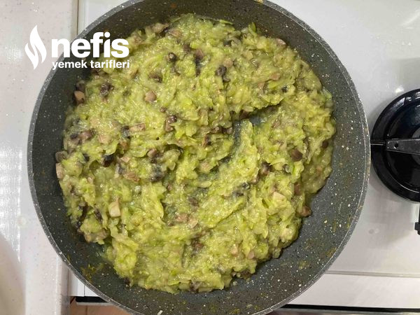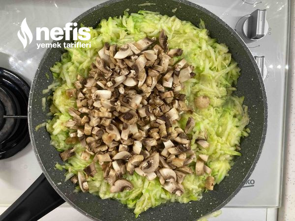 - Kavurduğumuz kabak ve mantarları bu karışıma ekleyip, karıştıralım.