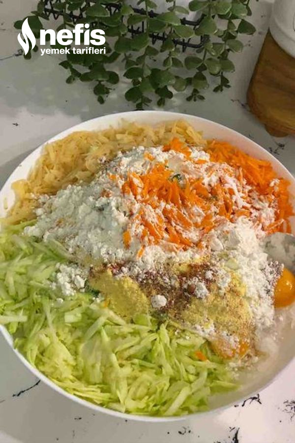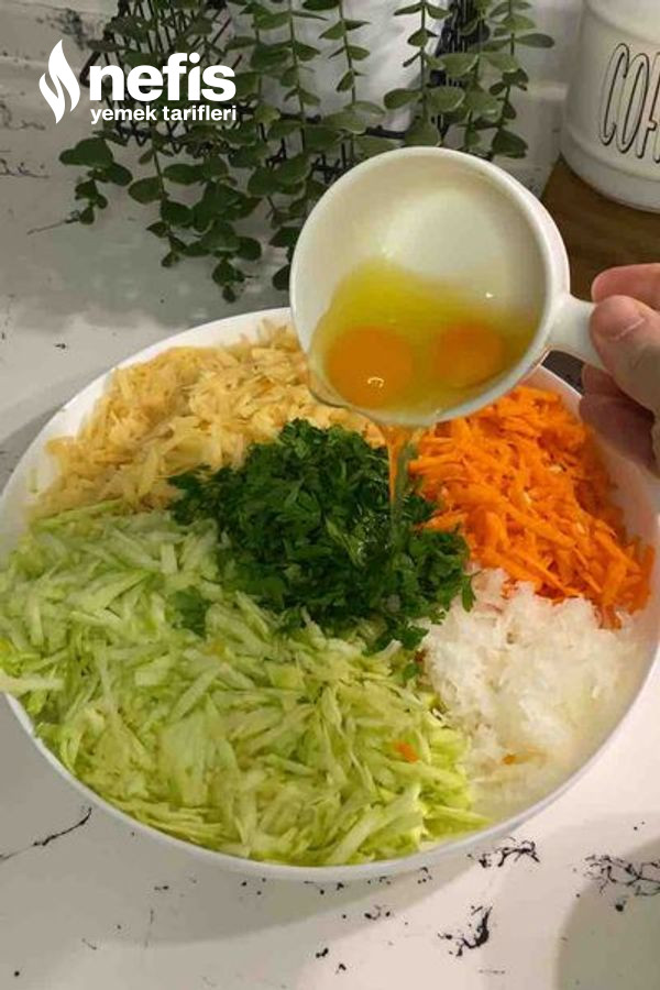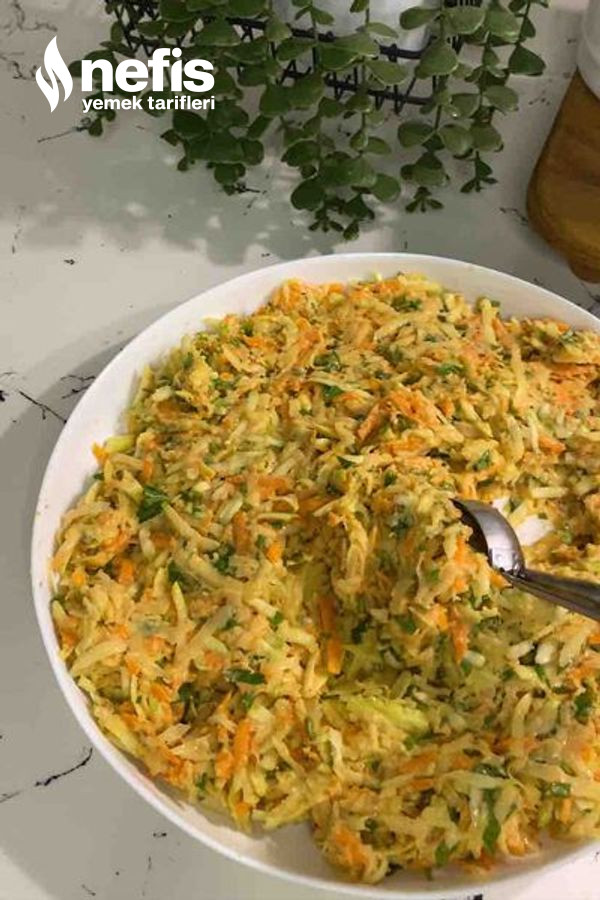 1. Sebzelerin hepsini rendeleyelim sularını sıkalım karıştırma kabına alalım.