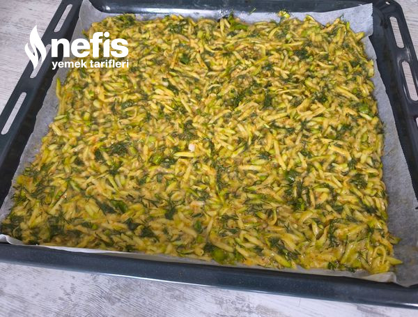 - Tepsiye fırın kağıdı sürelim üzerine mücver harcı eşit biçimde yayalım.