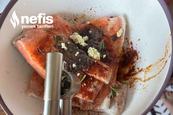 1. Somon filetoları bir kaba alıyoruz ,sırayla bütün materyalleri kaba ekleyip karıştırıyoruz .