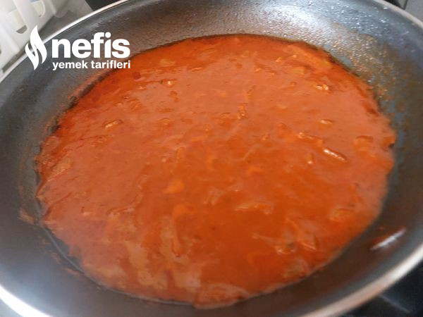 13. Üzerine 1,5 su bardağı kaynamış su ek edelim. 10 dakika kadar sosu pişmeye bırakalım.