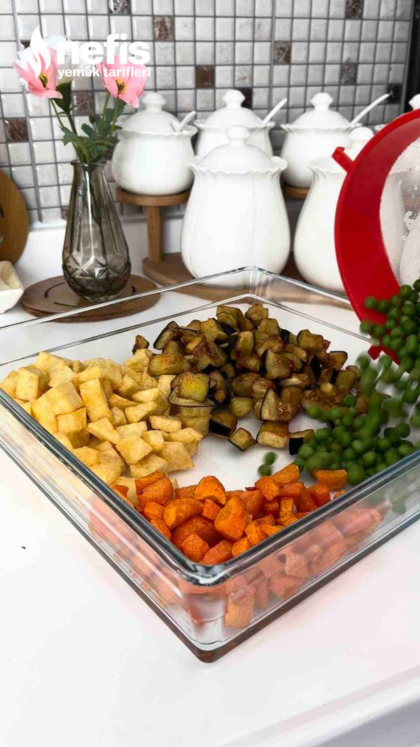 - Sebzelerimizi küp küp doğrayıp yağda kızartalım. Bezelyemiz haşlanmış olsun.