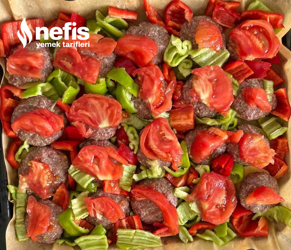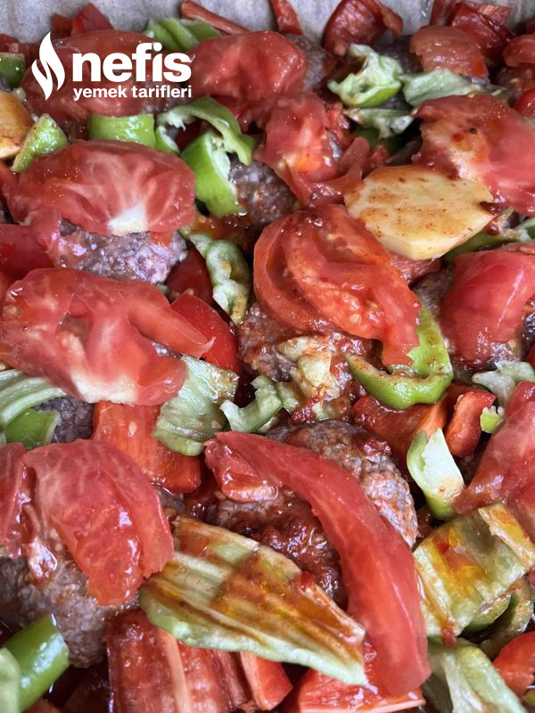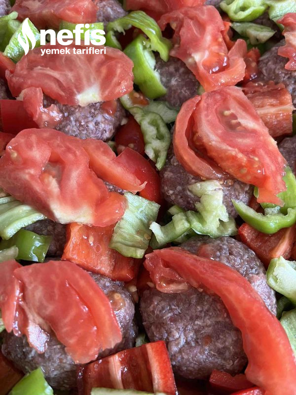 2. Patateslerimizi yuvarlak biçimde eşit biçimde kesip tepsiye diziyoruz. Patateslerin üzerine köfteleri diziyoruz. Köftelerin üzerine sırasıyla biber ve domatesleride diziyoruz.