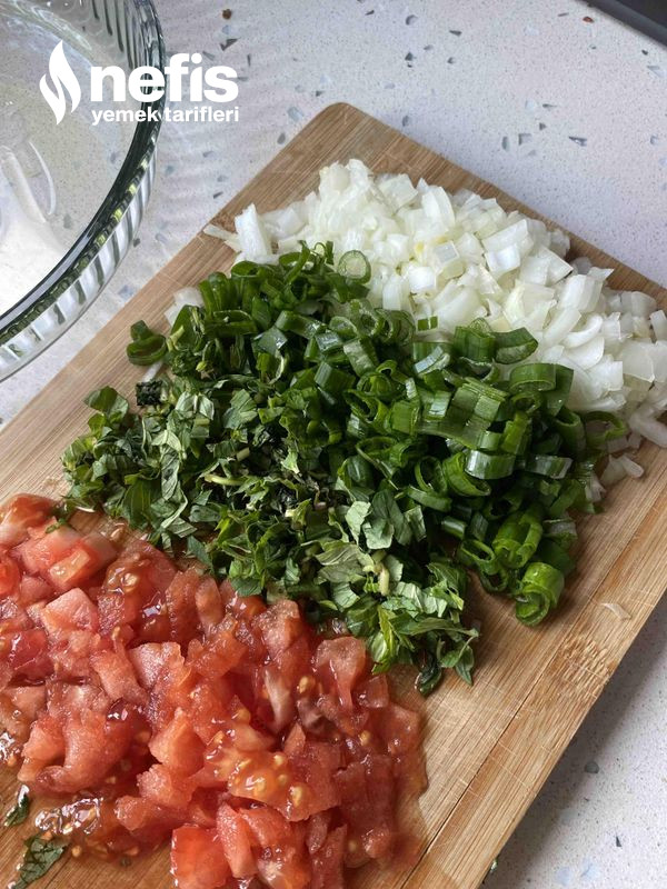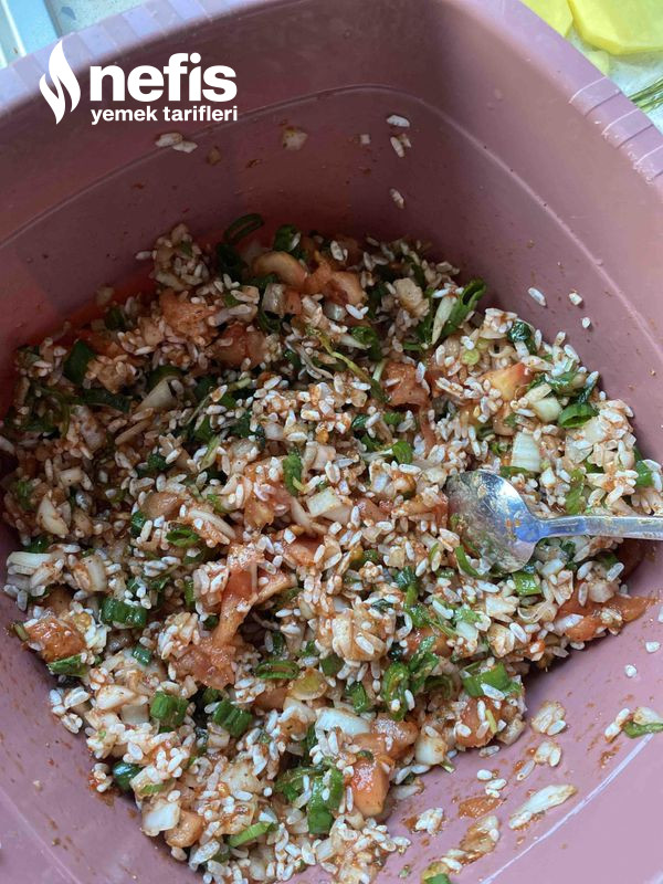 - Yıkadığımız pirinçlerin içine bulgurumuzu (isteğe göre) soğanımızı domateslerimizi nane taze soğanlarımızı ekliyoruz.