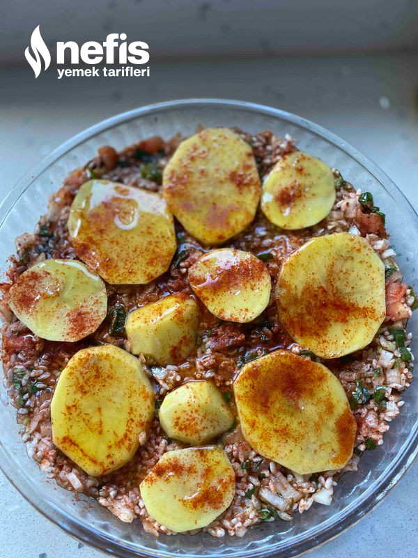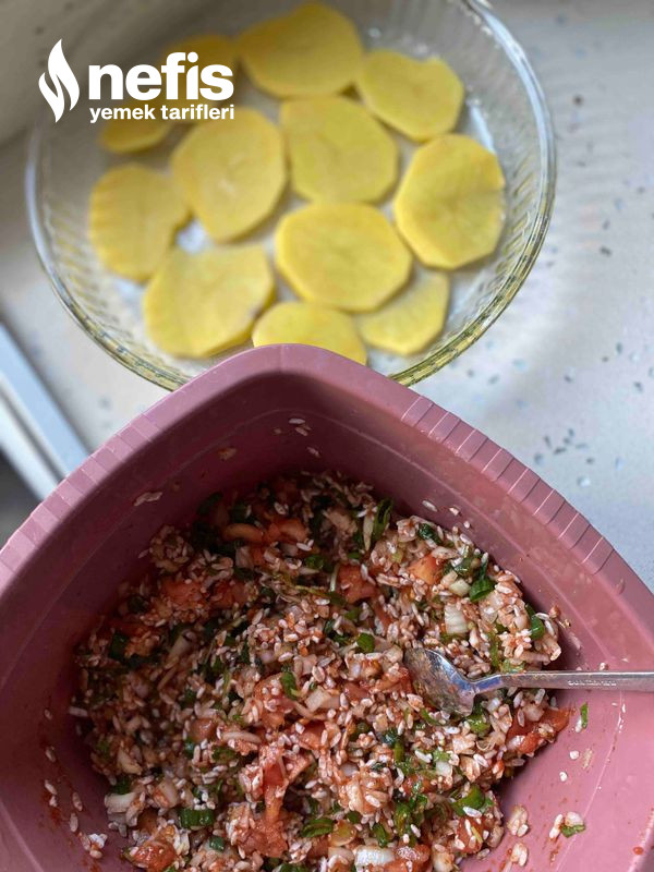 - Bütün materyalleri harmanlayıp güzelce karıştırdıktan sonra patateslerimizi uygun bi kaba alt kısmı patates ile kaplanacak halde diziyoruz.