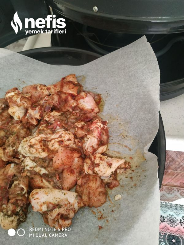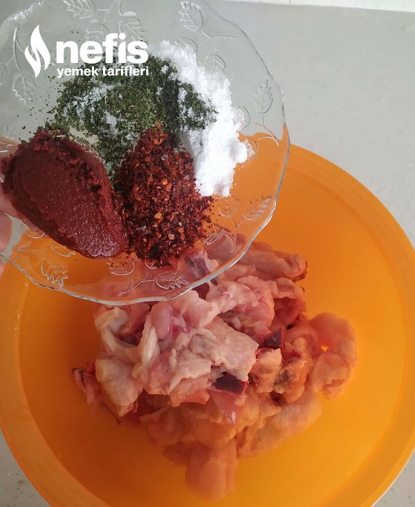 - Doğranmış tavuğumuzu 1 tatlı kaşığı tuz ,1 tatlı kaşığı nane,1 tatlı kaşığı pul biber ve yarım çay bardağı sıvı yağ ile harmanlıyoruz.